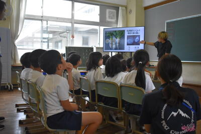 舞鶴市農林課の井本さんに依頼し、毎年お世話になっているしましまファームの田中まり様にお世話になり、教室で育て方や植え方のことを学び、学校園に出て実際に植えました。